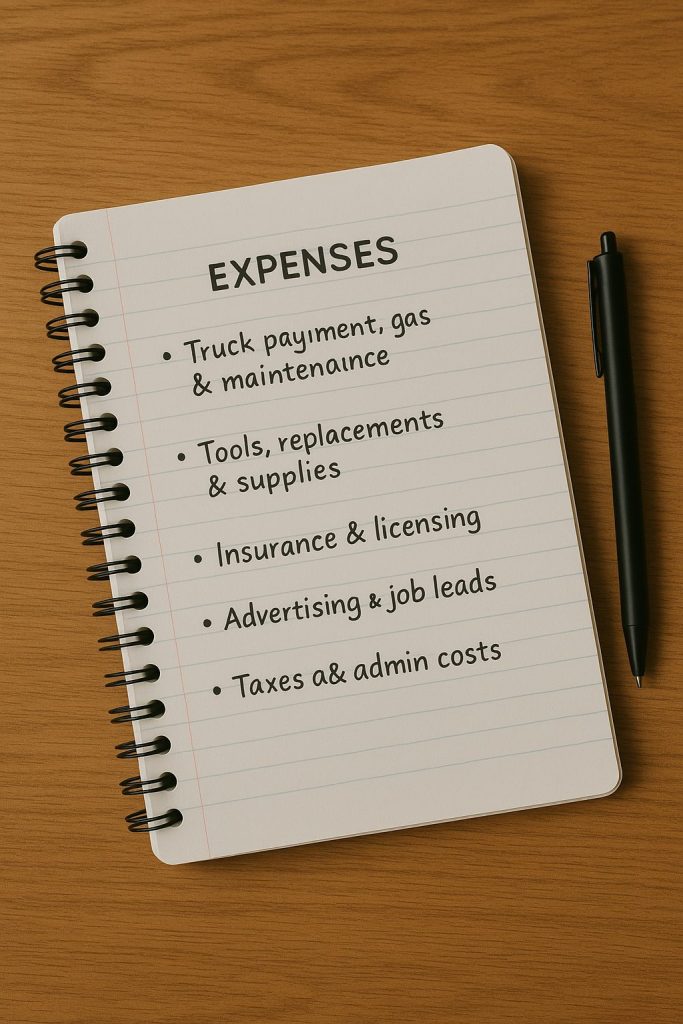 - Overhead: Add 10–20% to cover insurance, fuel, software, phone, and admin.
